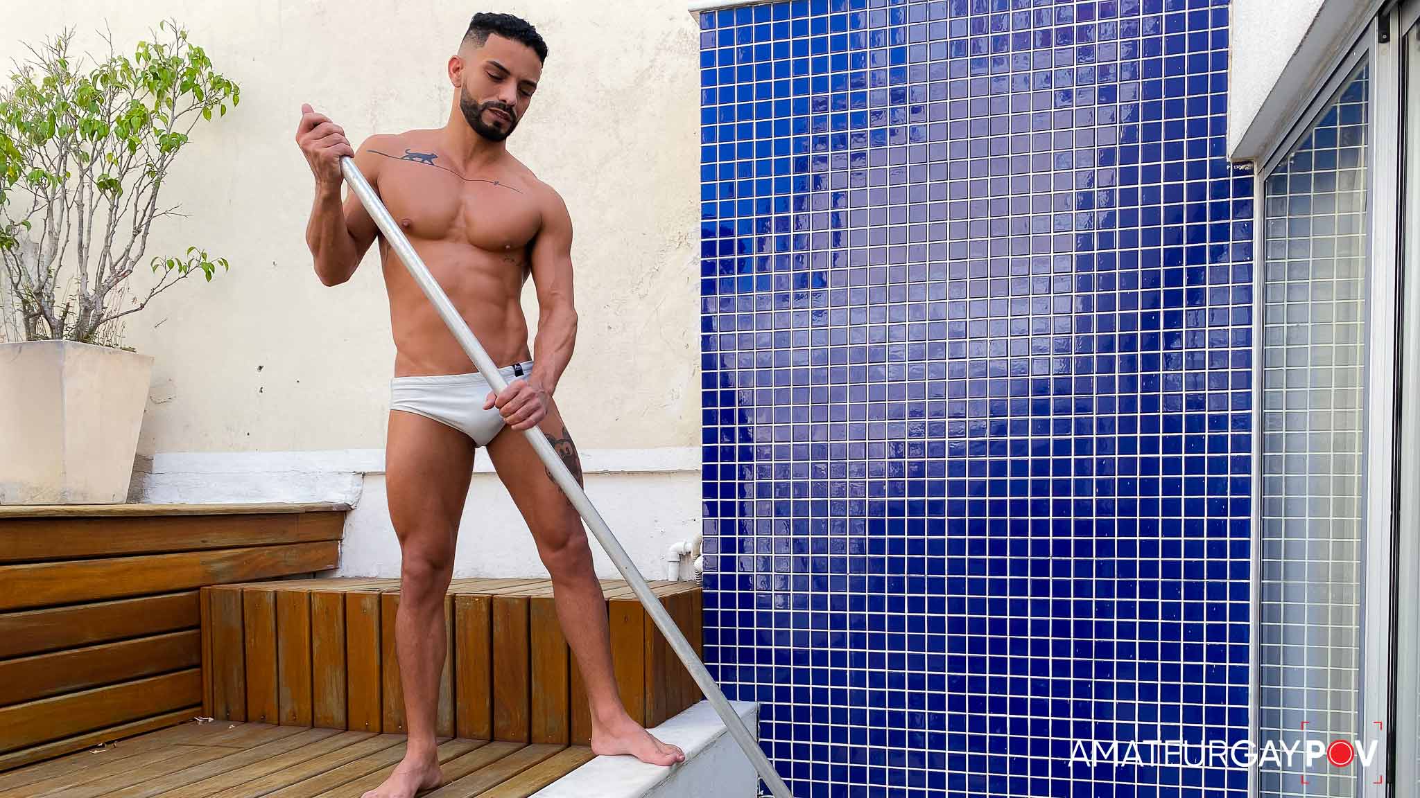 Wachen Sie geil auf (wie immer) und sehen Sie durch das Fenster einen sexy brasilianischen Poolboy (Ramon Souzza). Was tun Sie? Laden Sie ihn ein und lassen Sie ihn natürlich Ihren großen Schwanz bearbeiten!