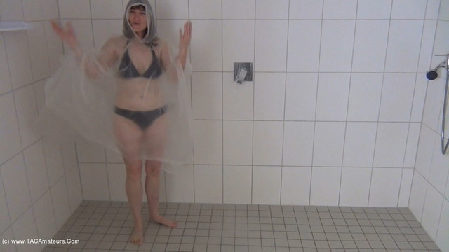 Noch ein Userwunschvideo.Diesmal der Regenponcho unter der Dusche aber mit Überraschung.Habe unter dem Bikini meine Liebeskugeln in meiner Fotze drin.