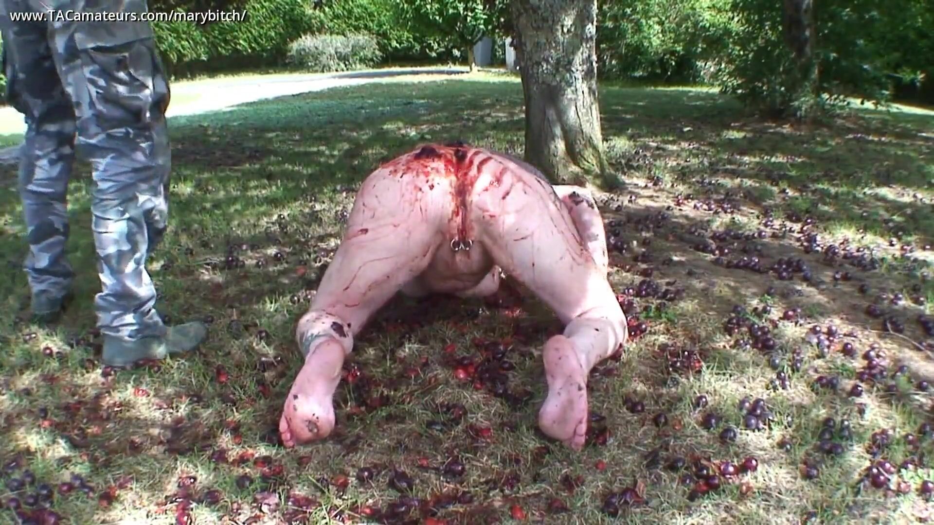 Mein Meister nimmt mich nackt mit in den Garten, um mit den roten Pflaumen zu spielen, die auf den Boden gefallen sind... Er zerquetscht Pflaumen auf meinen großen Titten, meinem Arsch, und er wichst meine Muschi, die ganz mit seinem roten Saft besudelt ist, ich masturbiere...