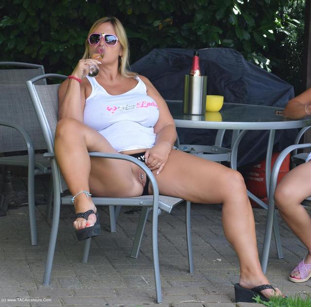 Melissa und Chris haben ihre Namen auf ihre sexy Shirts gedruckt. Wenn sie also auf eine Party oder eine Show gehen, weiß jeder, dass sie eine eigene Website haben. Um ihr neues Shirt zu feiern, trinken die Damen Champagner am Pool.