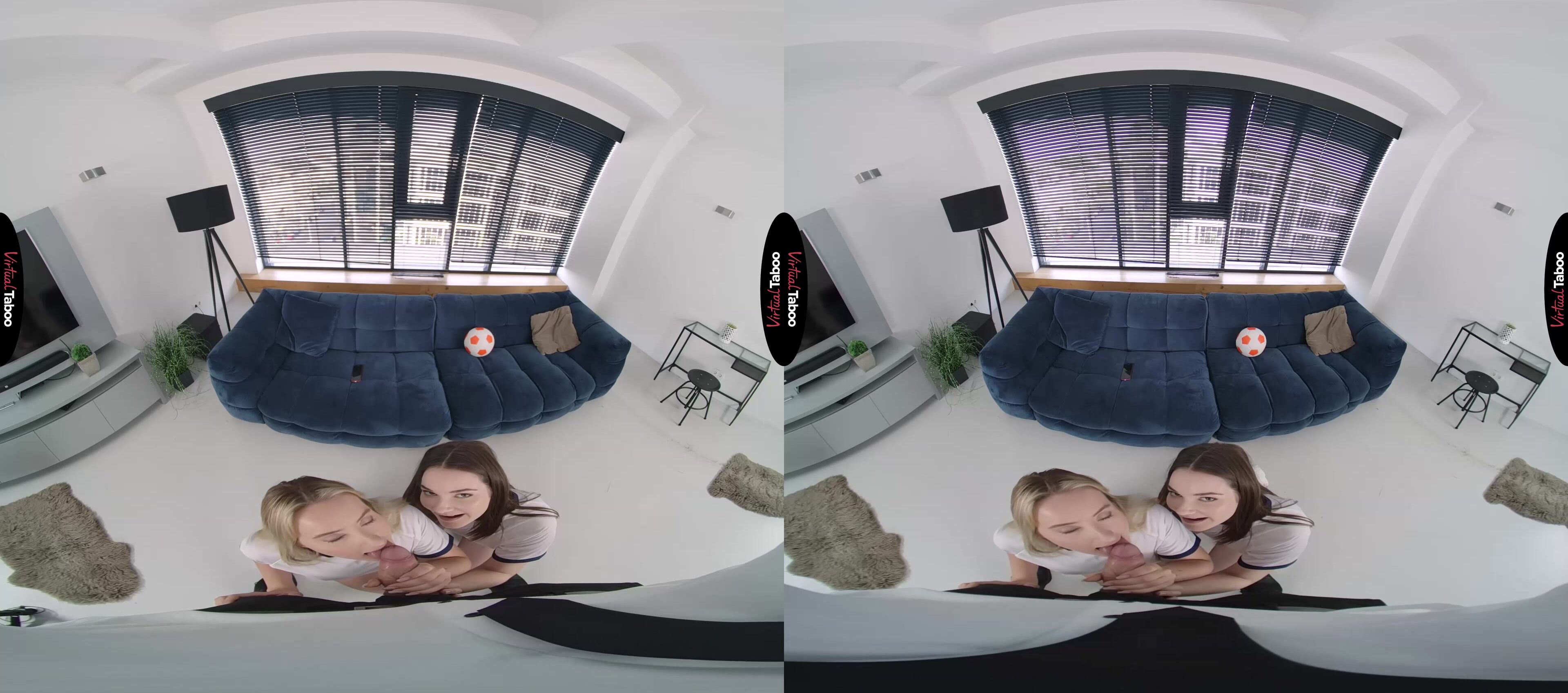 Simona Purr und Ann Joy sind beste Freundinnen und große Fußballfans. Simona hat es geschafft, einen Freund zu ergattern, der der Star ihres College-Teams ist. Sie möchte ihn bei Laune halten und beschließt, Ann zu bitten, ihr zu helfen, ein paar freche Fotos zu machen, die sie ihm zeigen kann. Die süße Blondine ist immer bereit zu helfen und fragt, ob sie auf den Fotos sein kann, um sie für Simonas Mann wirklich besonders zu machen. Sie machen ein paar sexy VR-Porno-Selfies, auf denen sie ihre knackigen Hintern in winzigen Fußballshorts zeigen. Es wird ziemlich heiß und sie ziehen sich gerade die Kleider aus, als Simonas Stiefvater nach Hause kommt und sie erwischt. Sie sind verlegen, aber Ann bemerkt, dass dein Schwanz hart ist, weil du sie so ansiehst. Sie flüstert Simona etwas ins Ohr und die Mädchen stimmen zu, etwas Neues und völlig Tabuisiertes auszuprobieren. Sie haben in ihrem Leben alles geteilt, außer einen Mann, und dein Schwanz ist einfach zu gut, um darauf zu verzichten. Simona ist überrascht, als sie feststellt, dass der Schwanz ihres Stiefvaters viel größer ist als der ihres Freundes. Sie schieben sich zusammen und schieben dein Fleisch zwischen ihren Mündern hin und her. Ann beugt sich vor und lässt sich von ihrer Freundin den pochenden Stab direkt in ihre enge Muschi führen. Sie tauschen die Plätze und Simona kann nicht glauben, dass sie tatsächlich ihren Stiefvater bumst. Du fickst sie hart und sie spürt, wie die Zunge ihrer Freundin über ihre Klitoris gleitet. Sie hat ihren Freund völlig vergessen. Die Mädchen haben angefangen, mit einem großen Ball zu spielen, und jetzt arbeiten sie hart daran, deinen Ball über ihre hübschen Gesichter zu saugen. Wer braucht schon Fußball, wenn Sex so viel mehr Spaß macht als VR-Pornos?