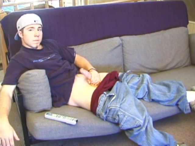 Während zur Stimulation ein Pornovideo läuft, zieht Cory Woodall seine Hose runter und schmiert seinen Penis ein. Er streichelt entschlossen, stößt ein paar Mal an den Rand, bevor er einen Schwall Sperma auf seinen Bauch spritzt.