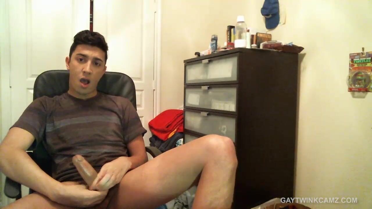 Alexio Duran schickte uns ein drittes selbstgemachtes Wichsvideo und wie schon beim ersten behält er dabei die ganze Zeit sein Shirt an. Es dauert nicht lange, bis er seine orangefarbenen Pumas auszieht und seinen dicken Penis streichelt. Die meiste Zeit seiner Cybersex-Show sitzt er auf einem Schreibtischstuhl, steht aber einmal auf, um uns seinen sexy Hintern zu zeigen. Dann geht es weiter an die Arbeit und irgendwann fängt das Sperma an zu fließen. Und wie schon beim ersten Video spritzt er sich voll aufs Shirt.