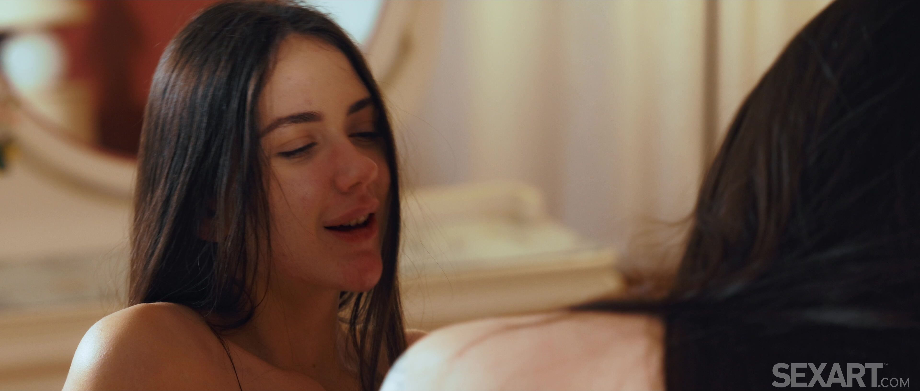 Die sinnliche Schönheit Adeline, eine hinreißende Brünette mit Kurven an den richtigen Stellen, sitzt an ihrem Schminktisch. Zu Beginn von Andrej Lupins erotischem Lesbenfilm „Verborgene Sehnsucht“ fährt sich Adeline mit einer Bürste durch ihr langes, seidiges Haar und sieht in einem strahlend weißen Hemdblusenkleid über einem zarten Spitzen-BH, der ihre schönen großen Brüste kaum bedeckt, mühelos verführerisch aus. Hinter ihr lümmelt die süße Vixi Rafi auf dem Bett und beobachtet sie mit einem wissenden Lächeln. Schlank und anmutig trägt sie einen Spitzen-BH und enge Jeans, die ihren Dutt betonen, und strahlt lässiges Selbstvertrauen aus. Ihre Blicke treffen sich im Spiegel, ein stiller Austausch entzündet sich zwischen ihnen. Die Luft summt vor unausgesprochener Spannung, als Adeline aufsteht und den Raum durchquert. Sie kniet neben Vixi nieder und fährt mit ihren Fingern durch die dunklen Locken, ihre Berührung verweilt ein wenig zu lange. Ihre Stimmen senken sich zu einem Flüstern, das Gespräch wird verspielt und neckisch. Dann treffen sich ihre Lippen, als würden sie von einer unsichtbaren Kraft angezogen – erst langsam, dann tiefer, während die Welt draußen verschwindet.