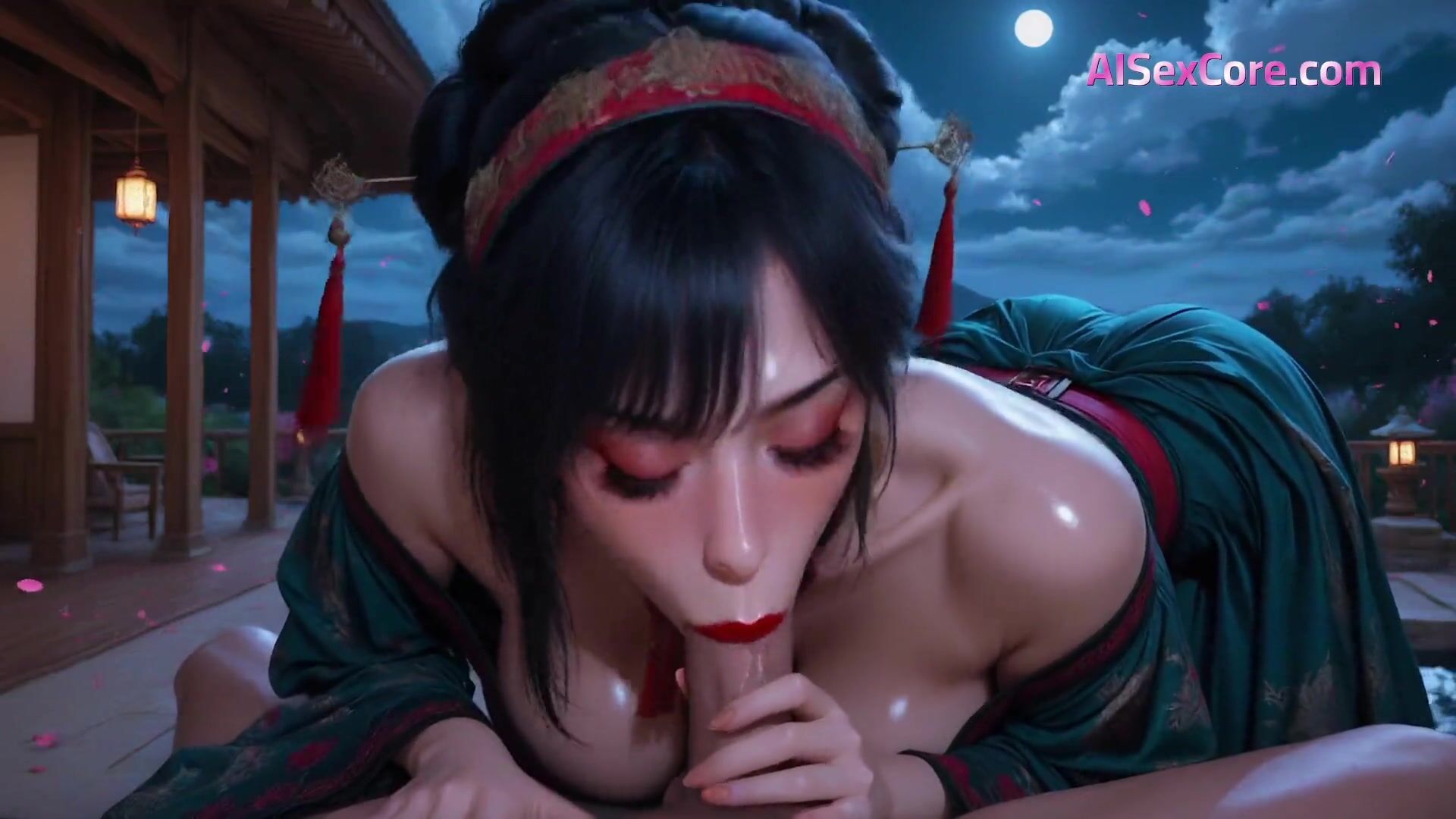 Eine wunderschöne Frau mit großen Brüsten und einem seidigen Kimono erzeugt eine sanfte Mitternachts-Sex-Atmosphäre und vereint Eleganz und Verlangen in dieser fesselnden, KI-generierten Szene.
